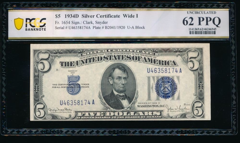 One 1934D $5 Silver Certificate PCGS 62PPQ.