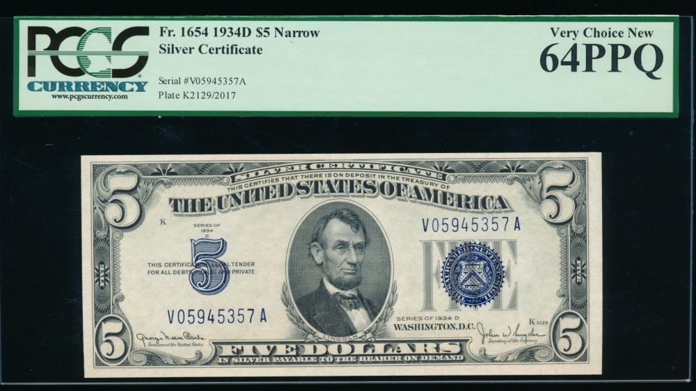 One 1934D $5 Silver Certificate PCGS 64PPQ.