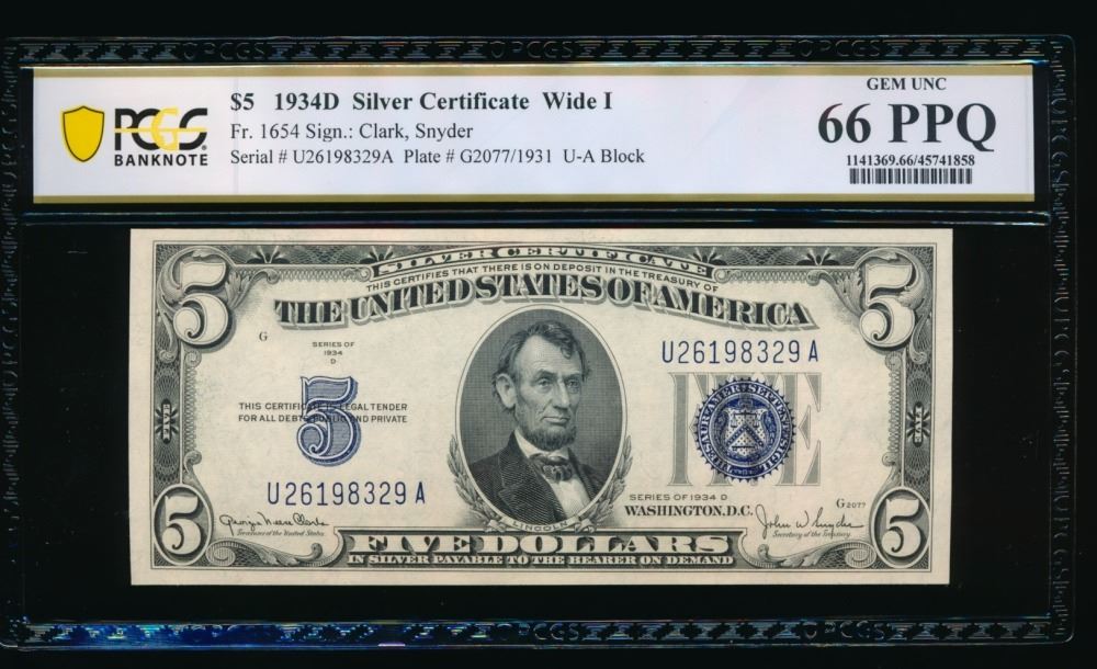 One 1934D $5 Silver Certificate PCGS 66PPQ.