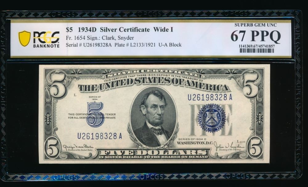 One 1934D $5 Silver Certificate PCGS 67PPQ.