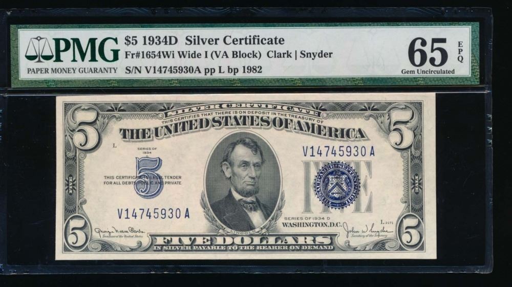 One 1934D $5 Silver Certificate PMG 65EPQ.