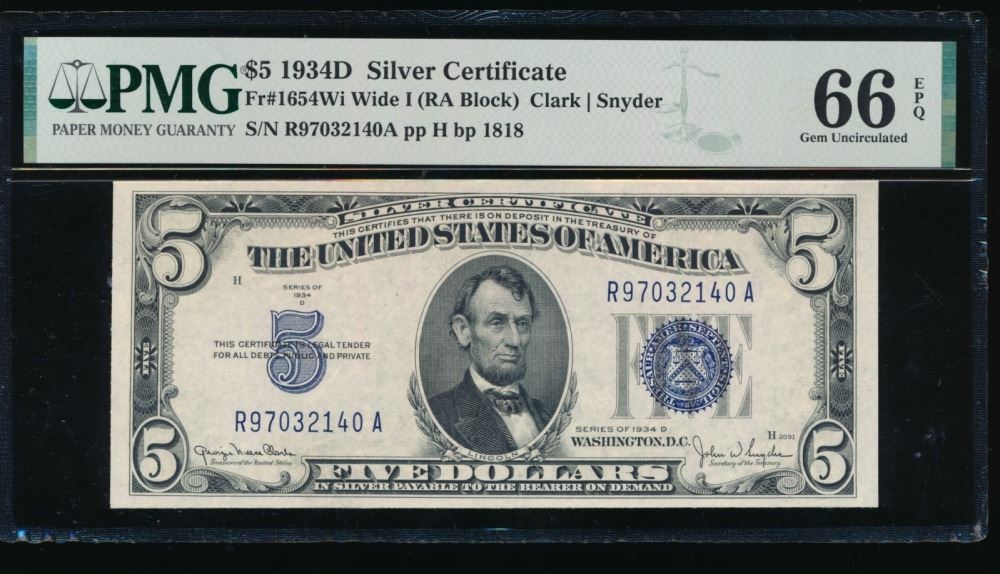 One 1934D $5 Silver Certificate PMG 66EPQ.