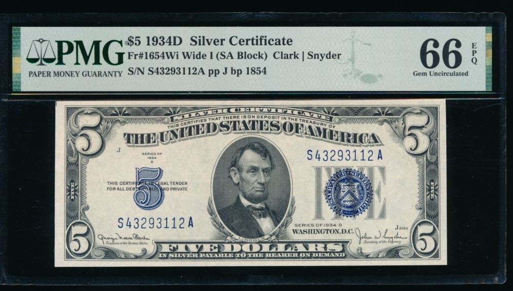 One 1934D $5 Silver Certificate PMG 66EPQ.