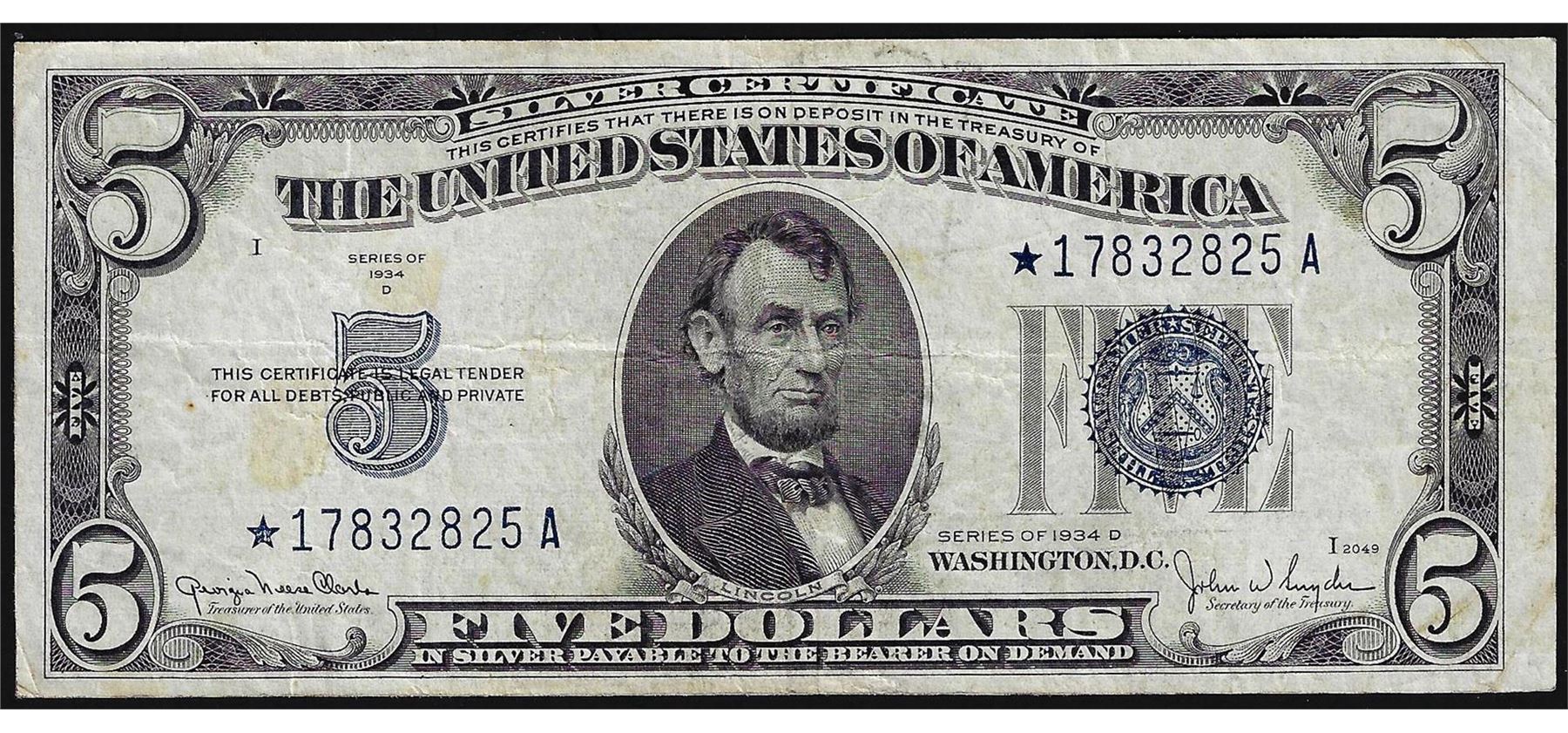 One 1934D $5 Silver Certificate STAR Note.