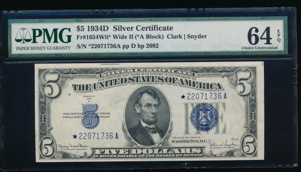 One 1934D $5 Silver Certificate Star Note PMG 64EPQ.