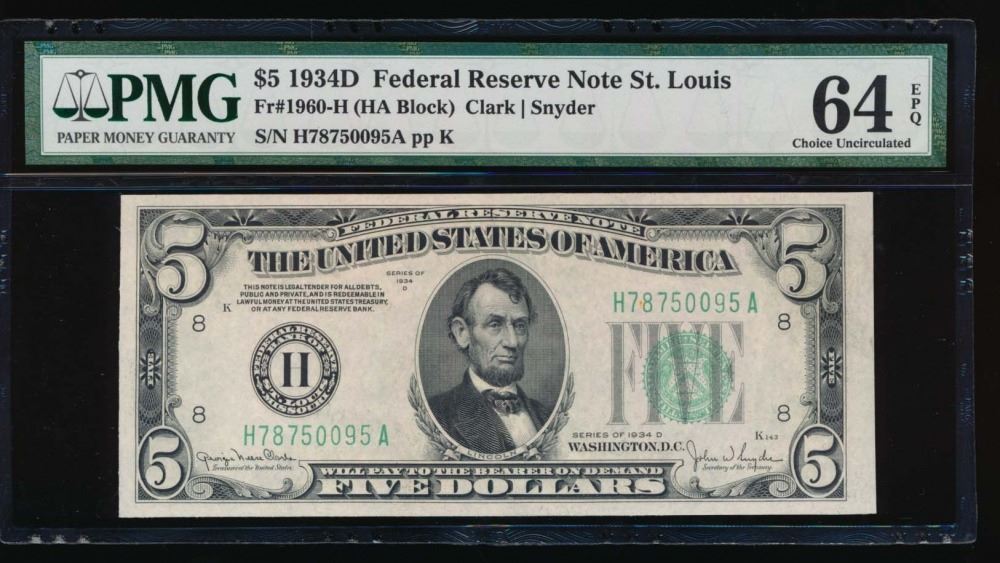 One 1934D $5 St. Louis Federal Reserve Note PMG 64EPQ.