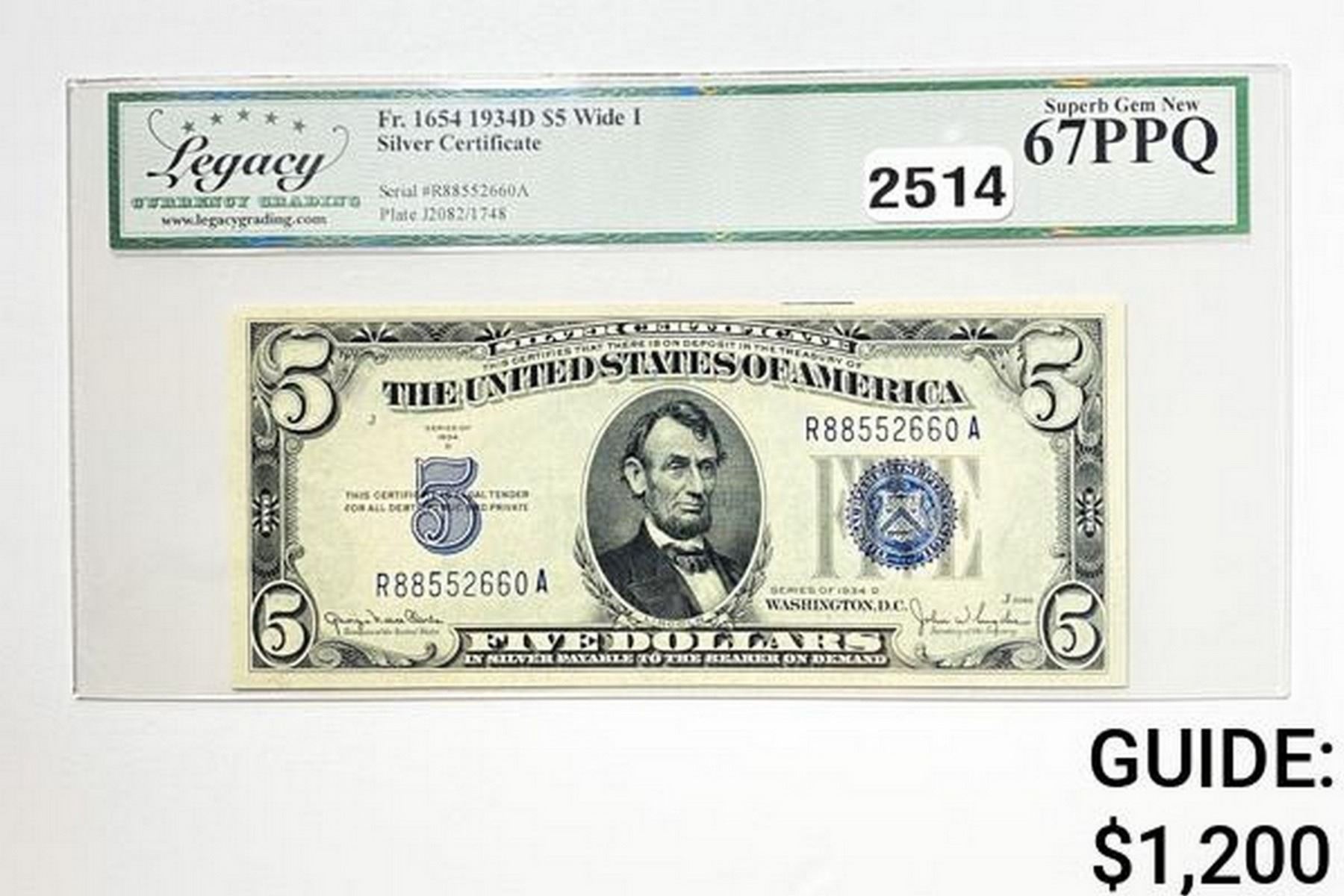 1934D $5 U.S. SIlver Certificate-Wide I LCG 67 PPQ