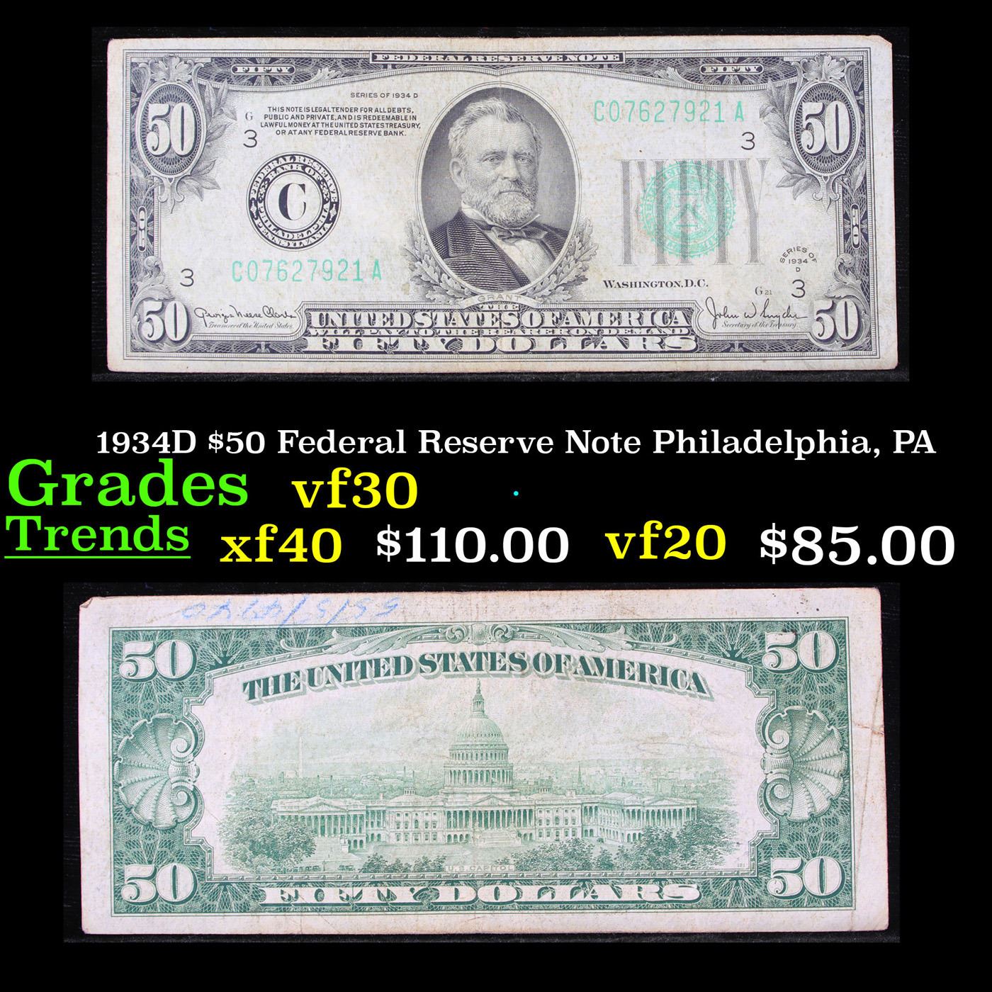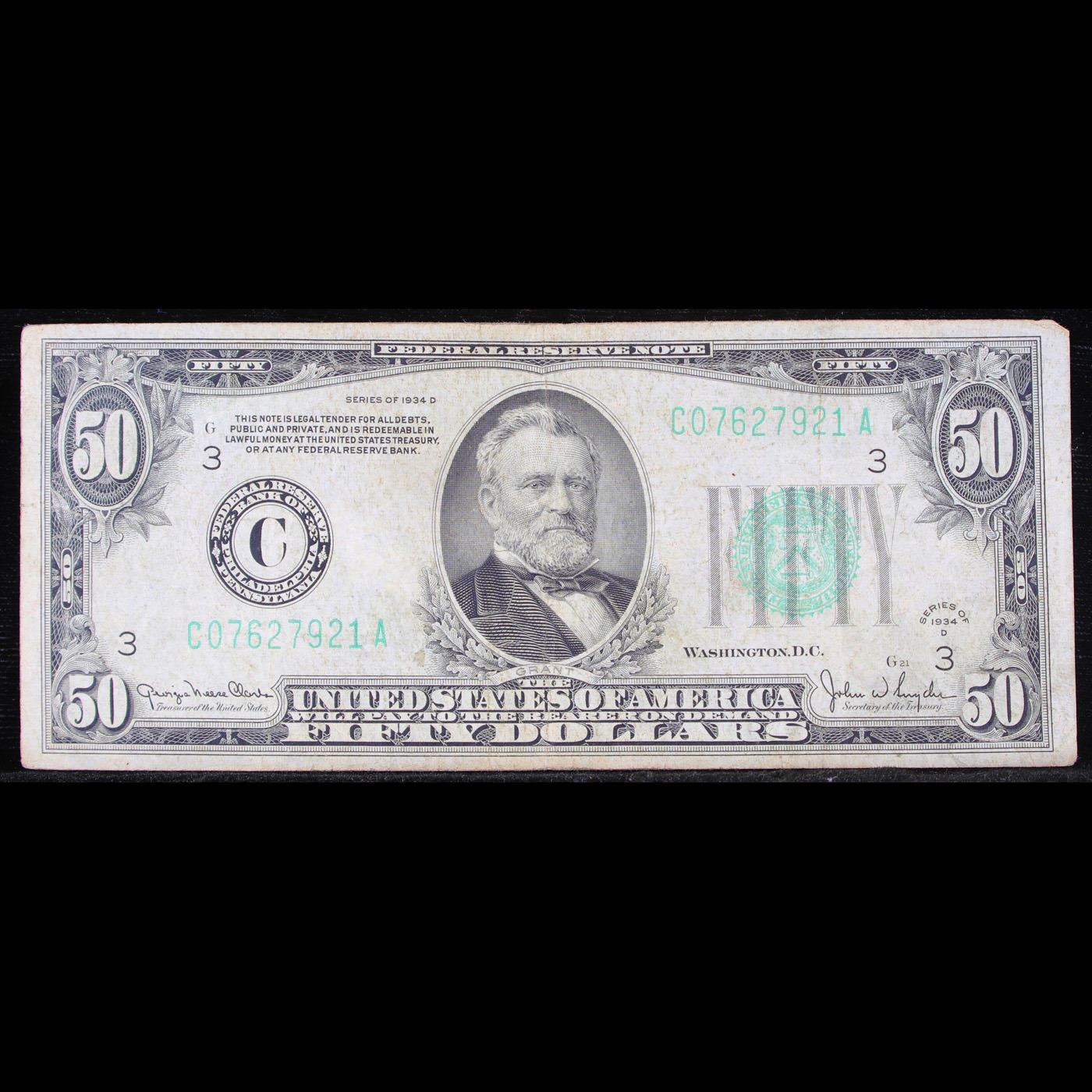 1934D $50 Federal Reserve Note Philadelphia, PA Grades vf++.