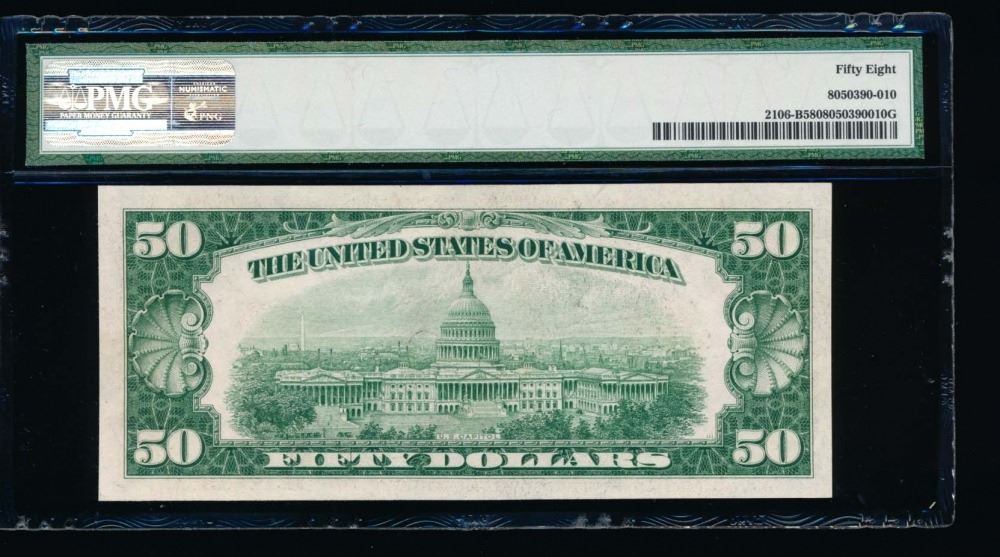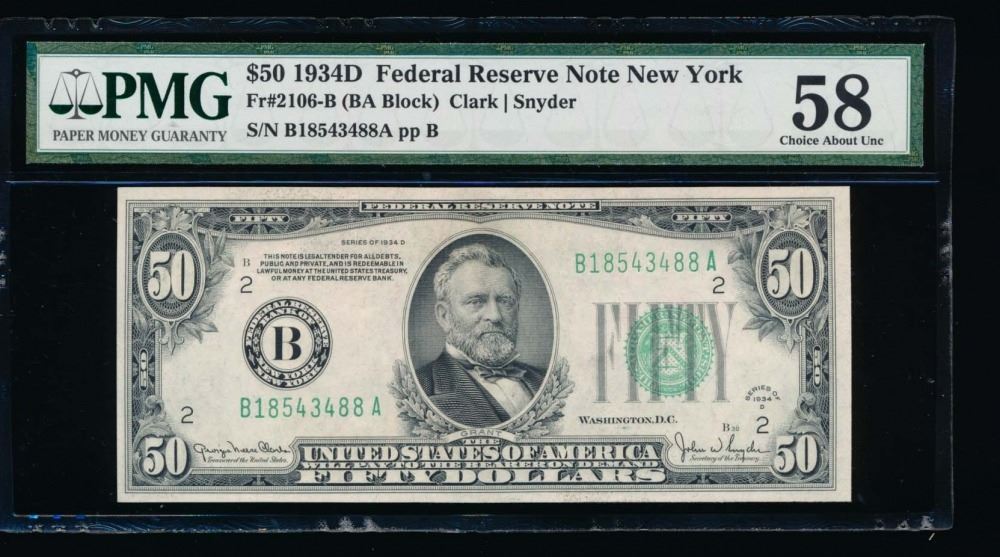 One 1934D $50 New York Federal Reserve Note PMG 58.