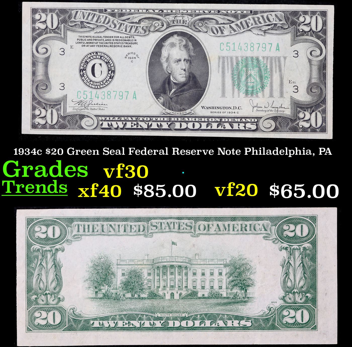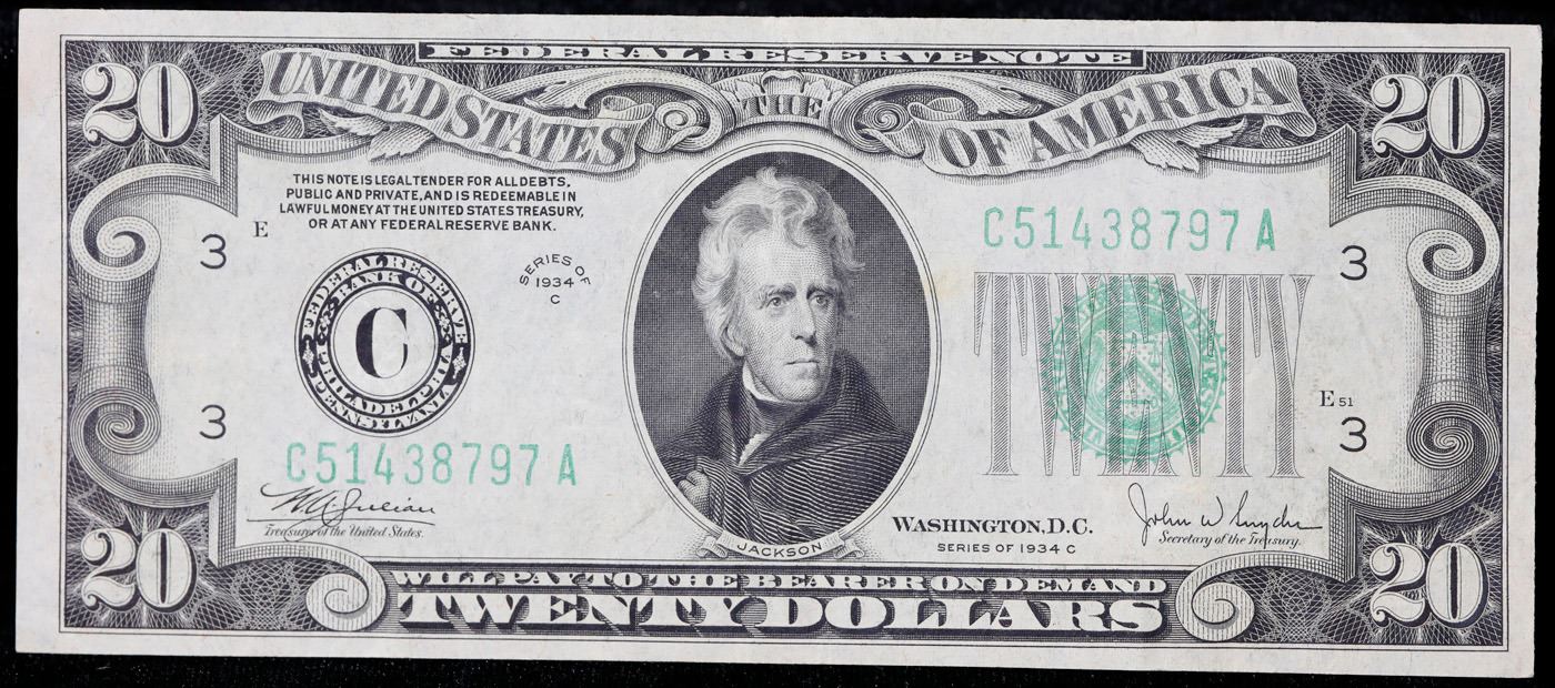 1934c $20 Green Seal Federal Reserve Note Philadelphia, PA Grades vf++