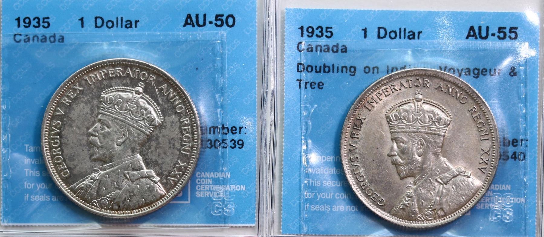 1935 $1, 1935 "Doubling on Indian, Voyageur & Tree" Both coins CCCS About Uncirculated-50 to Choice