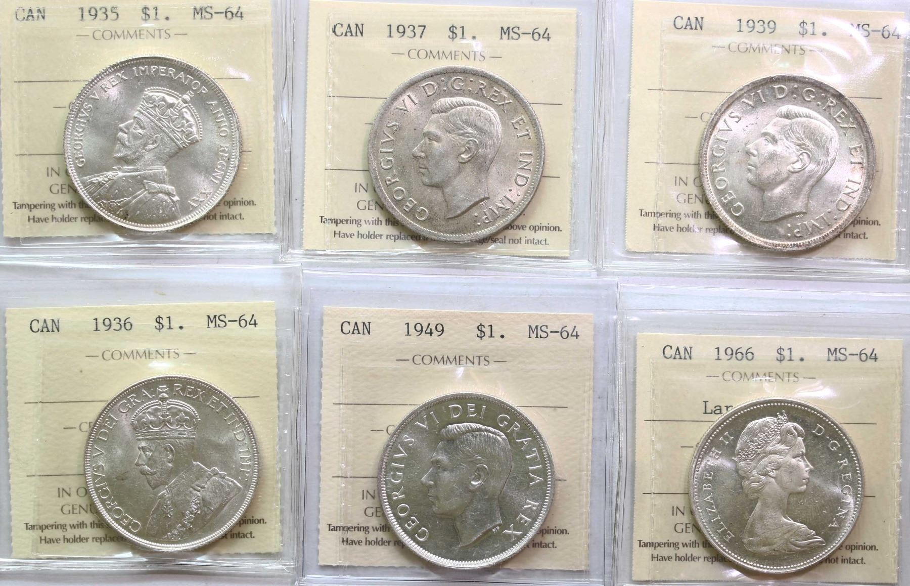 1935 $1, 1936, 1937, 1939, 1949, 1966 "LB", All 6 coins ICCS Very Choice Mint State-64. Brilliant and lustrous.