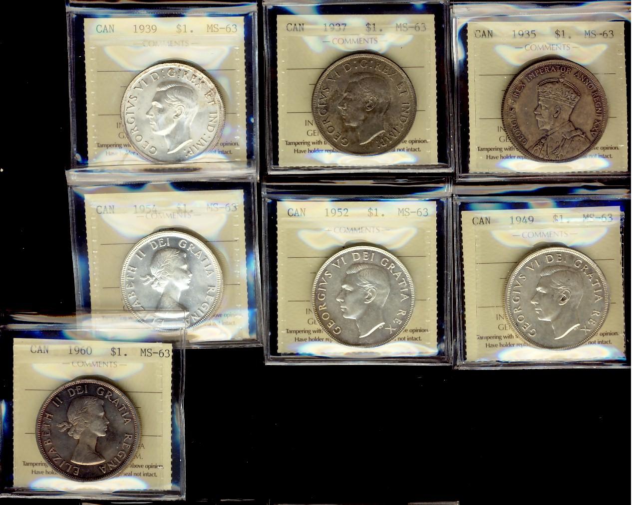 1935 $1 , 1937, 1939, 1949, 1954 & 1960 ICCS MS63. Lot of 7 coins.