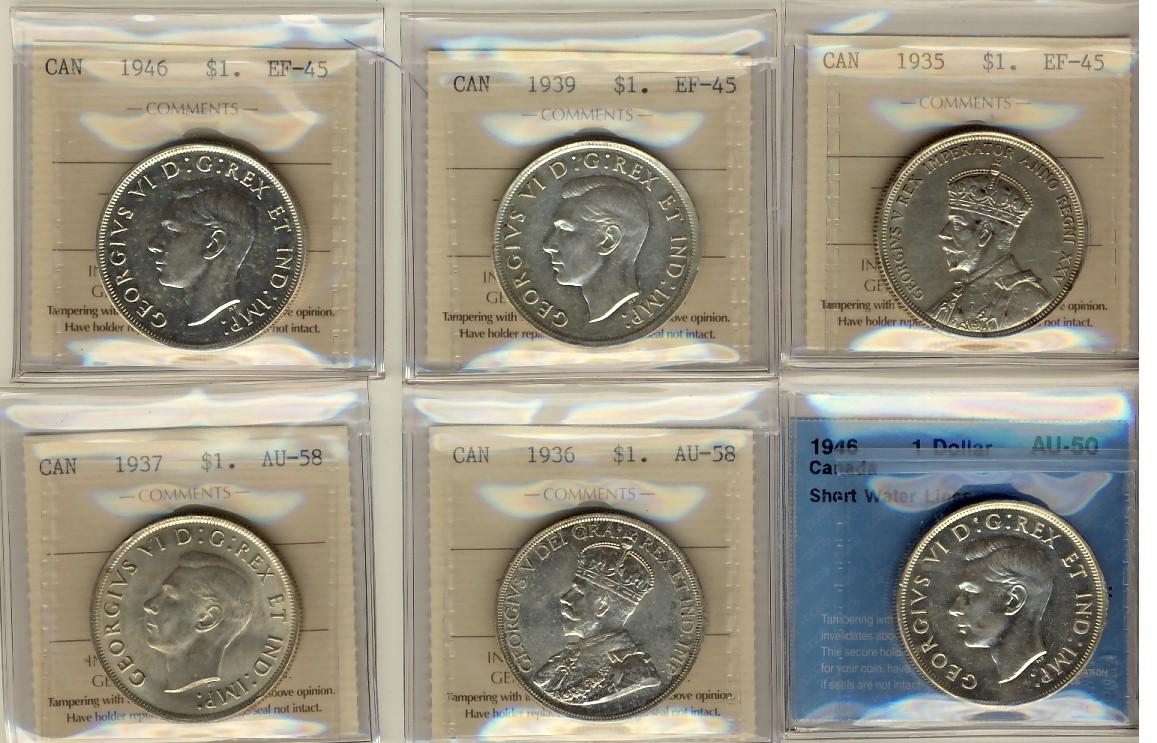 1935 $1, 1939 & 1946 EF45, 1946 SWL AU50, 1936 & 1937 AU58. Lot of 6 coins all 3rd party graded.