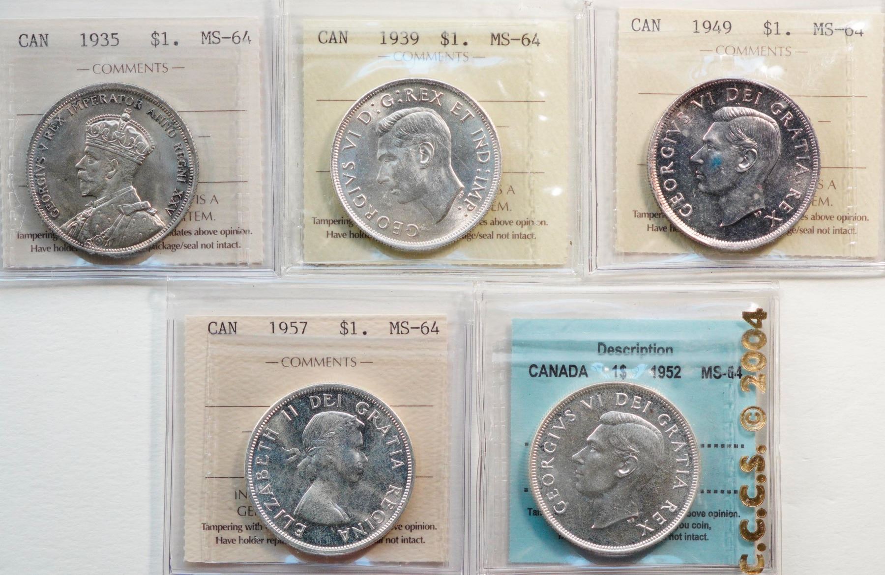 1935 $1,1939, 1949, 1957, 1952. lot of 5 coins ICCS & CCCS Choice Mint State-64