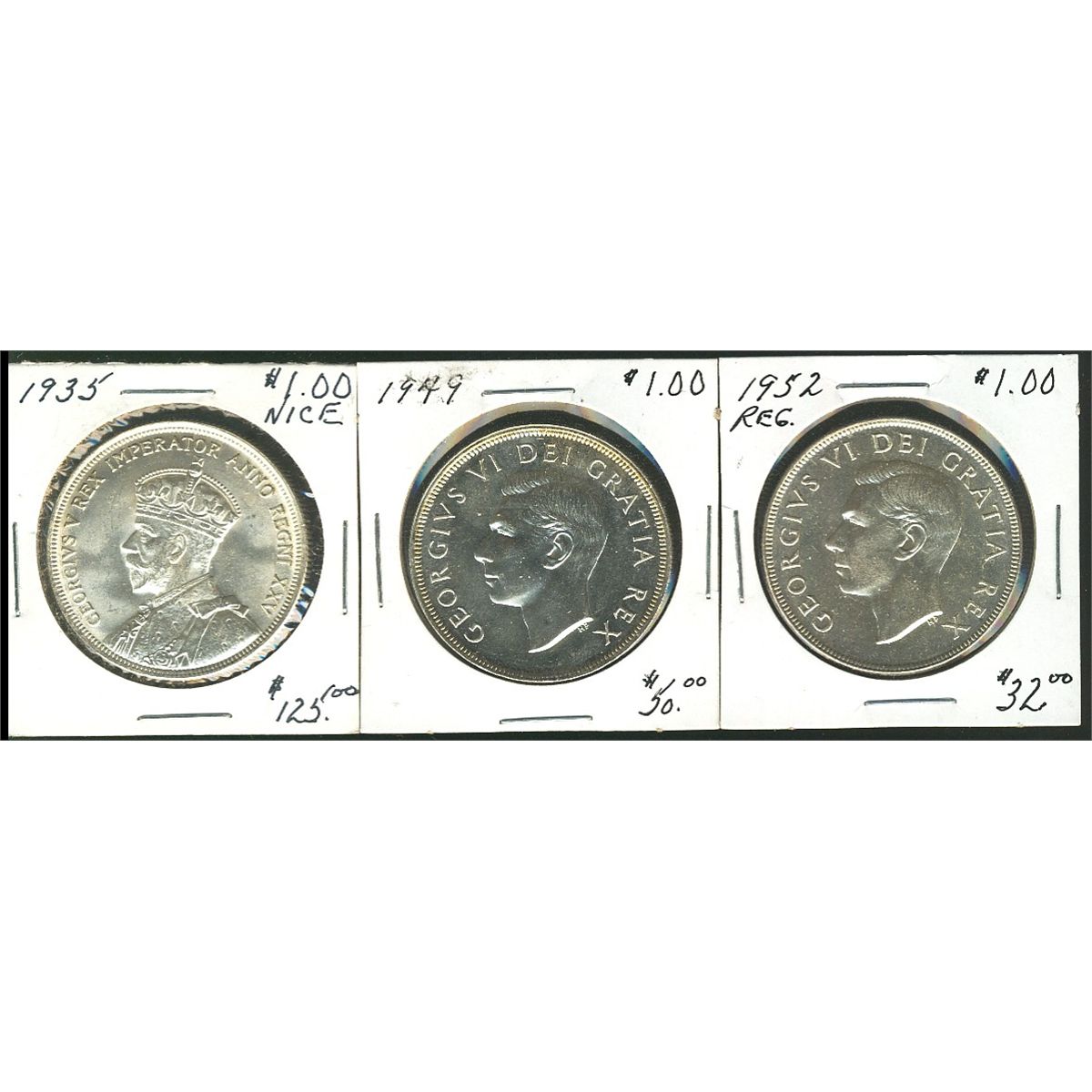 1935 $1, 1949 & 1952 BU. Lot of 3 coins. (PBA).