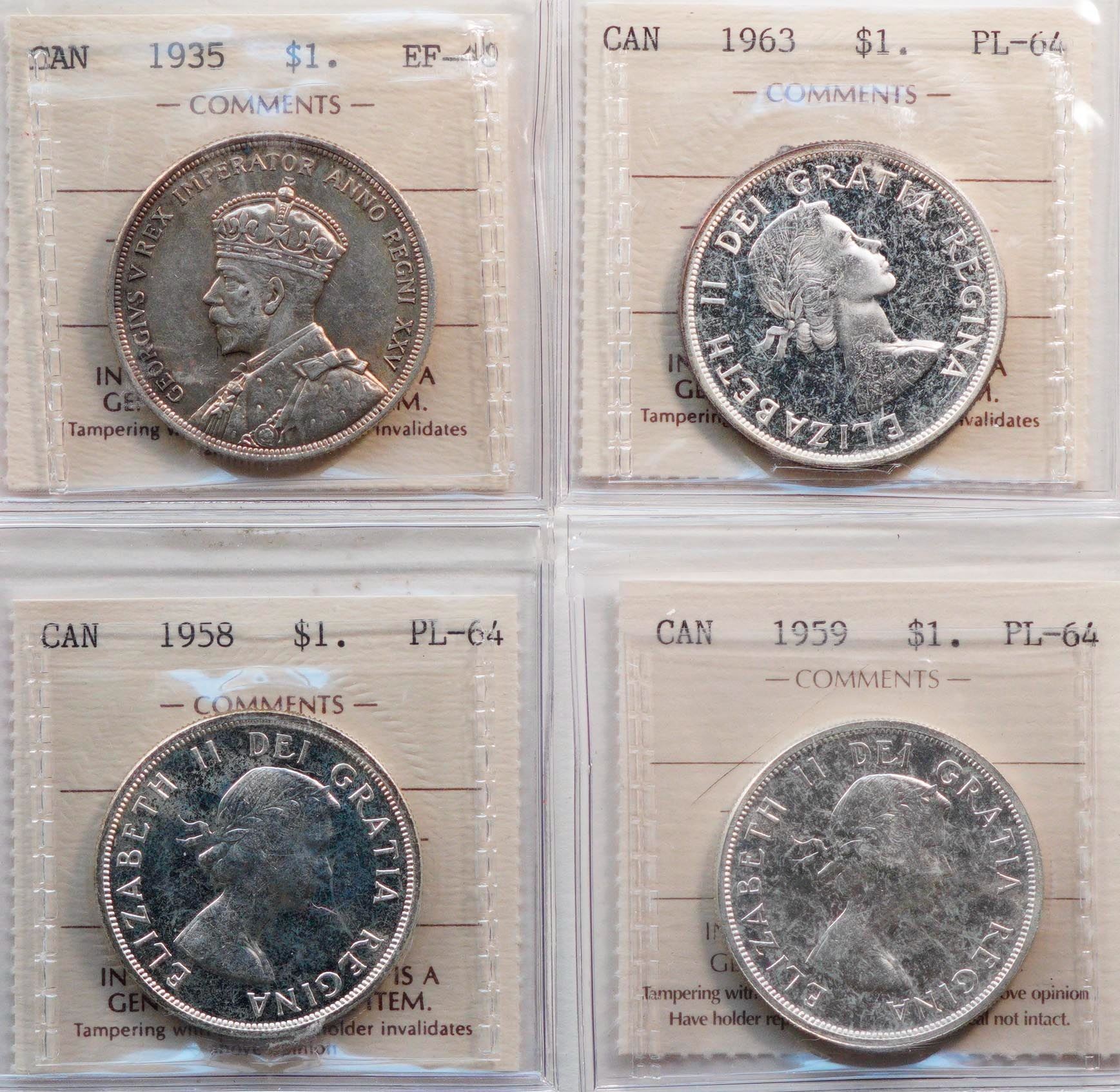 1935 $1, 1963 "Cameo", 1958, 1959. Lot of 4 coins ICCS Extra Fine-40 to Choice Proof-Like-64
