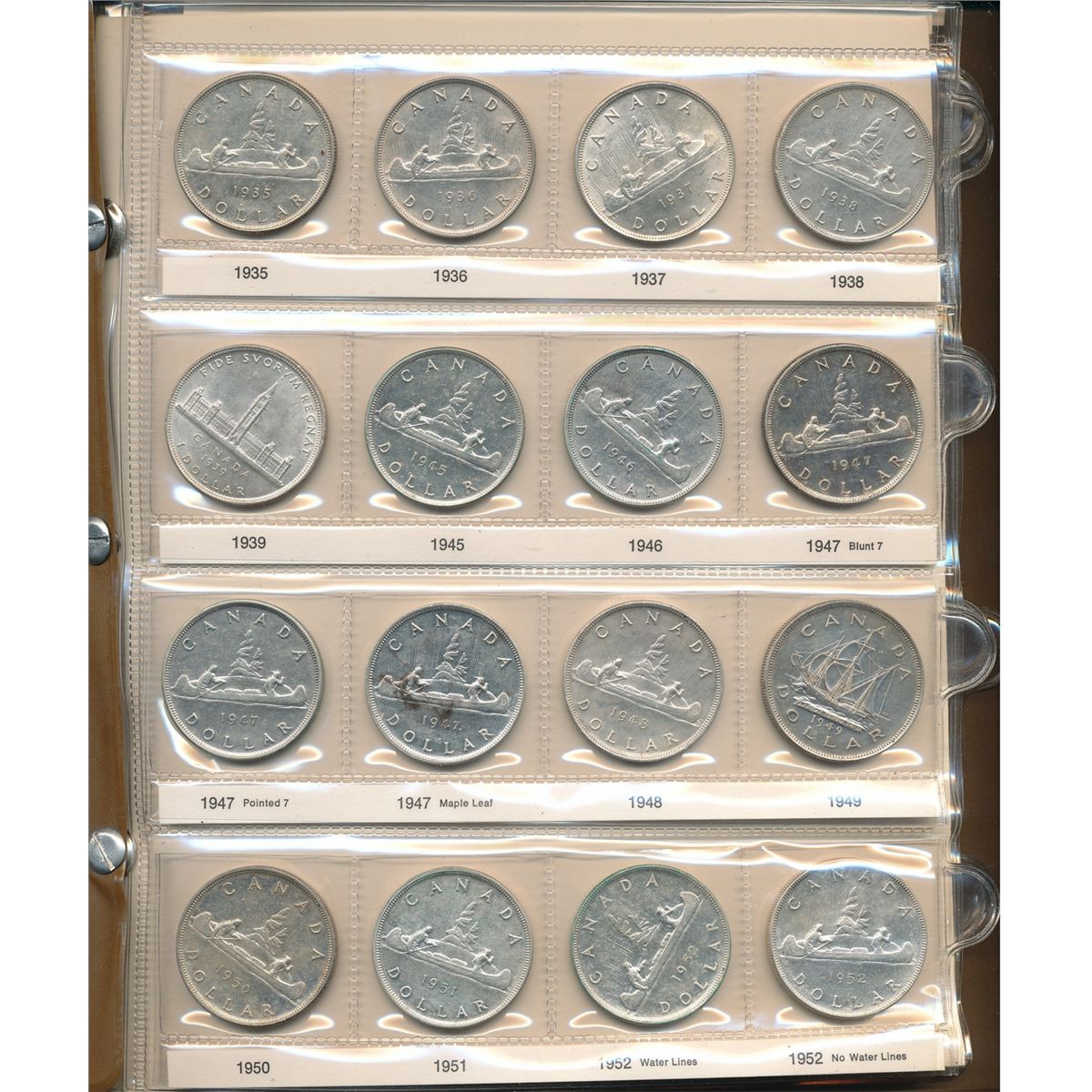 1935 $1 - 1979 Complete Date Set; includes key issues 1938, 1945, 1946, 1947 Blt, 1947 Ptd, 1947 ML & 1948 all EF or better. Nice collection of 58 pcs VF to MS housed in old Brown Whitman holder. Some coins with cleaning issues. 1948 shows some moderat