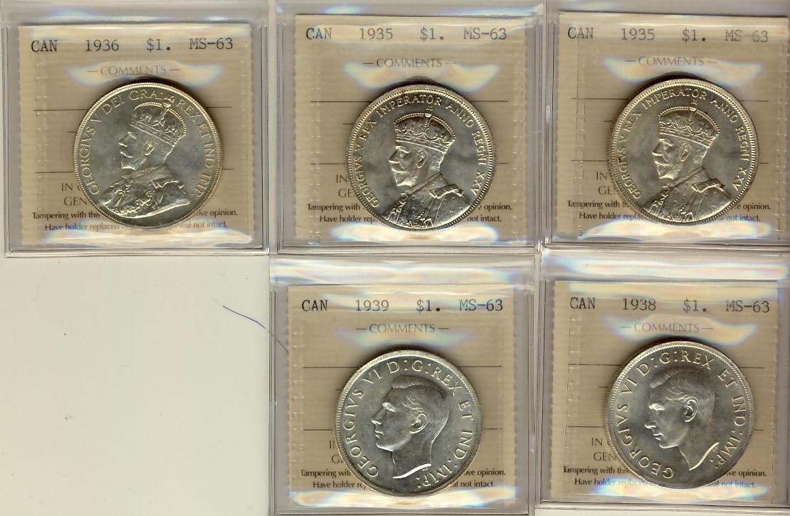 1935 $1(2), 1936, 1938 & 1939 ICCS MS63. Lot of 5 coins.
