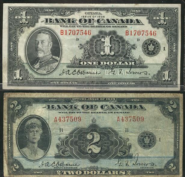 1935 $1 BC-1 #B1707546 VF and $2 BC-3 #A437509. Number 9 written and attempt to erase in top right hand corner. VG. Lot of 2 notes.