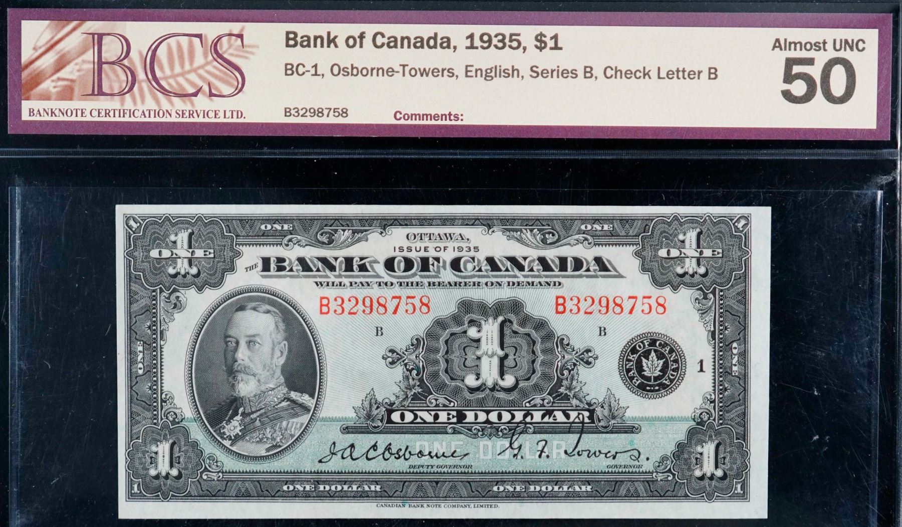 The cataloguer has taken every reasonable measure to ensure that all of the lots in this sale are as described and genuine. All raw coins and banknotes have been graded by the cataloger or the auction house which represent our best professional opinion. To grade coins and banknotes, we use Canadian grading standards, 42 years of experience and good conscience. However, grading is a subjective description in the opinion of the cataloger or the auction house. Among experts there are often differences of opinion on the grading and the eye appeal of a coin. The strike and the state of preservation are often debated. The Canadian Numismatic Company acts as an agent between consignors and buyers. The Canadian Numismatic Company does not guarantee that any coin or banknote cataloged will meet the standards, or the grade, of any third party grading companies. No warranty, whether impressed or implied. Items are as is, no warranty given. We cannot accept responsibility and waive all liability resulting in financial losses, and or incidentals accruing from the sale of any items, nor can we guarantee that items graded by third party services will grade the same if submitted to a different grading service or re-submitted to the same company. Statements by The Canadian Numismatic Company regarding the condition, the eye appeal, the strike and the population of items are for guidance only. All lots offered are sold "AS IS". Title to all lots remains with the auction house until paid for in full by the purchaser. But they are held at the risk of the purchaser once the time of the sale.