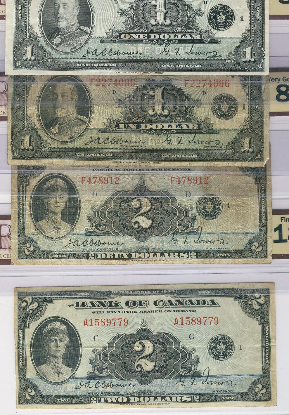 1935 $1 BC-1 VF20, BC-2 VG8, BC-3 F18 & BC-4 VG8. Lot of 4 notes all BCS graded.