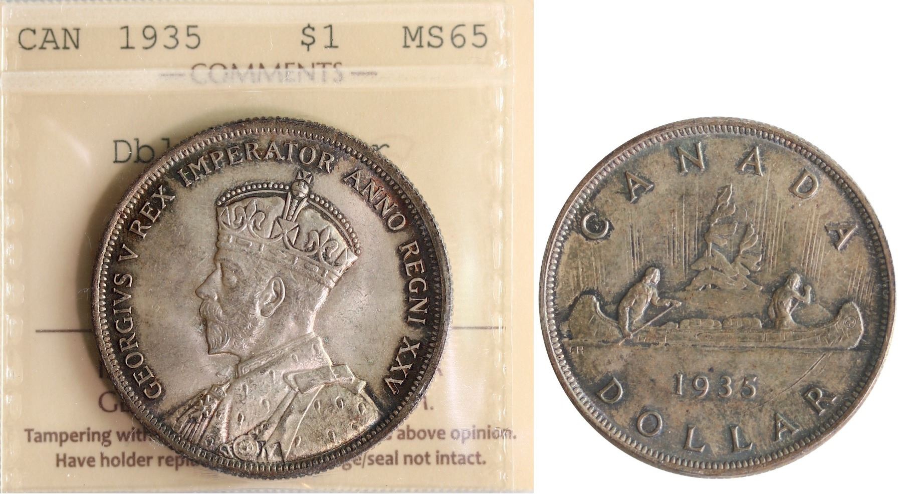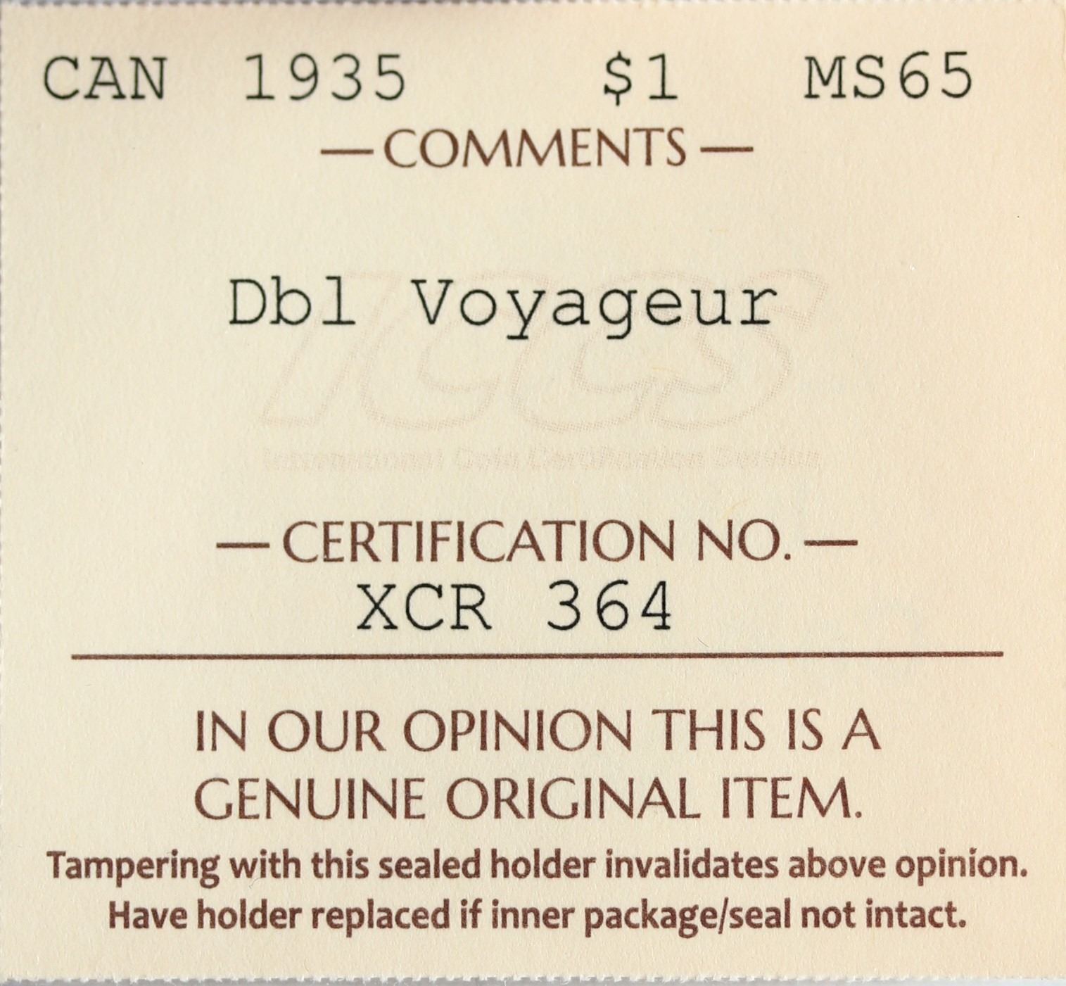 1935 $1 "Dbl XXV & Dbl Voyageur" ICCS Gem Mint State-65, Lightly toned
