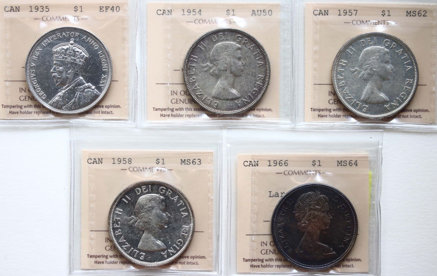 1935 $1 Dbl XXV ICCS Extra Fine-40, 1954 $1 SWL ICCS About Uncirculated-50, 1957 $1 ICCS Choice Mint State-62, 1958 $1 ICCS Choice Mint State-63, 1966 $1 LgBeads ICCS Choice Mint State-64. Lot of 5 coins.