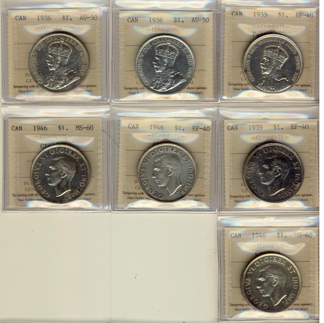 1935 $1 EF40, 1936 AU50(2), 1939, 1946 EF40 & 1946 AU50(2). Lot of 7 coins all with comments.