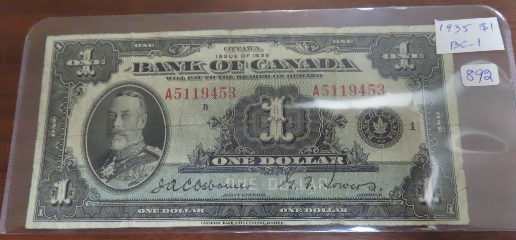 1935 $1. English. Osborne-Towers signatures. Series Letter A. Sheet Number B. Commemorates the Silver Jubilee (25th Anniversary) of King George V. He died the following year. BC-1. VG-8.