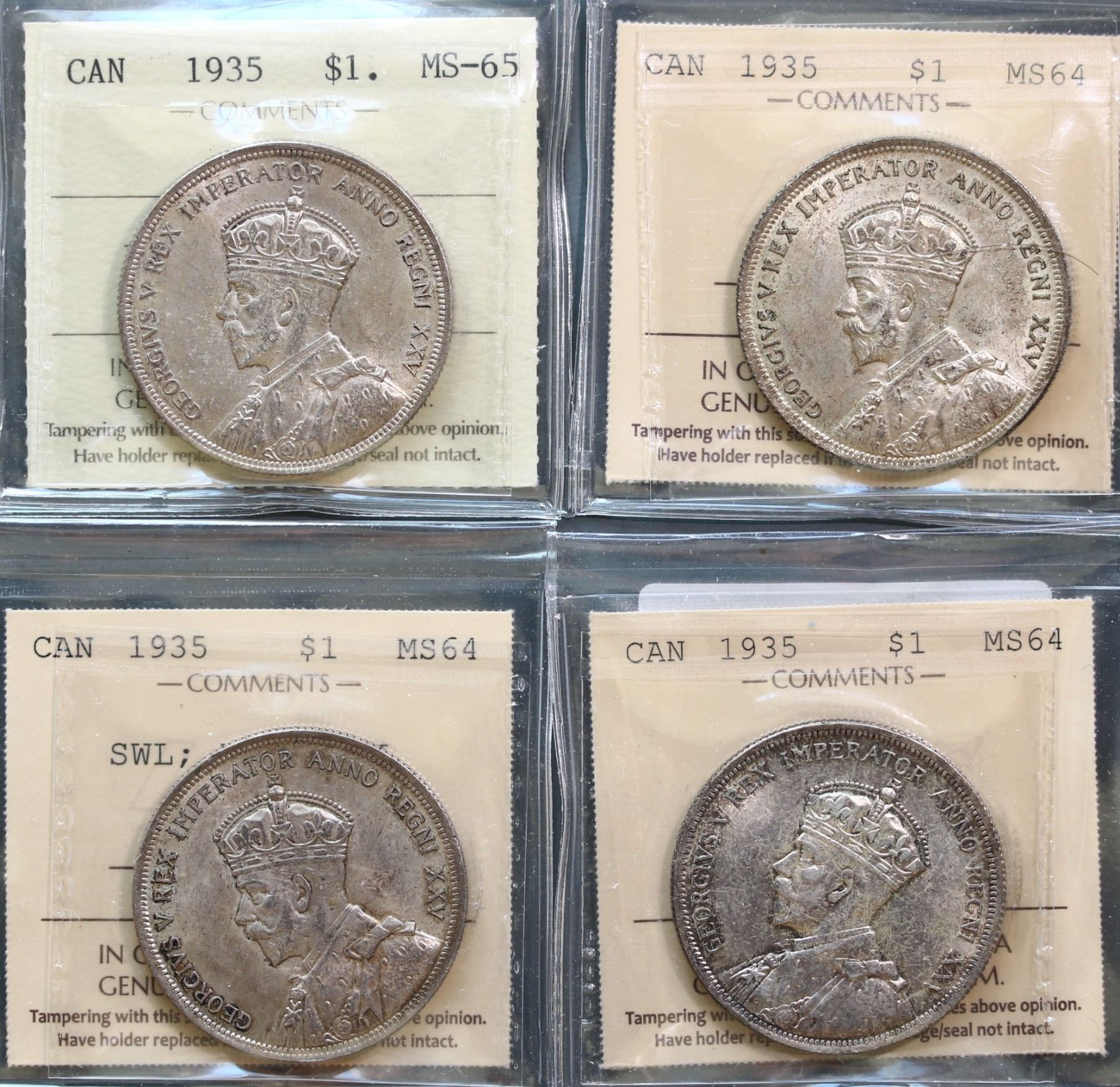 1935 $1 Gem Mint State-65, "Regular issue" 1935 "SWL" Choice Mint State-64, 1935 "SWL; Rear SWL" Choice Mint State-64, 1935 "Rear SWL", all ICCS graded, lot of 4 coins.