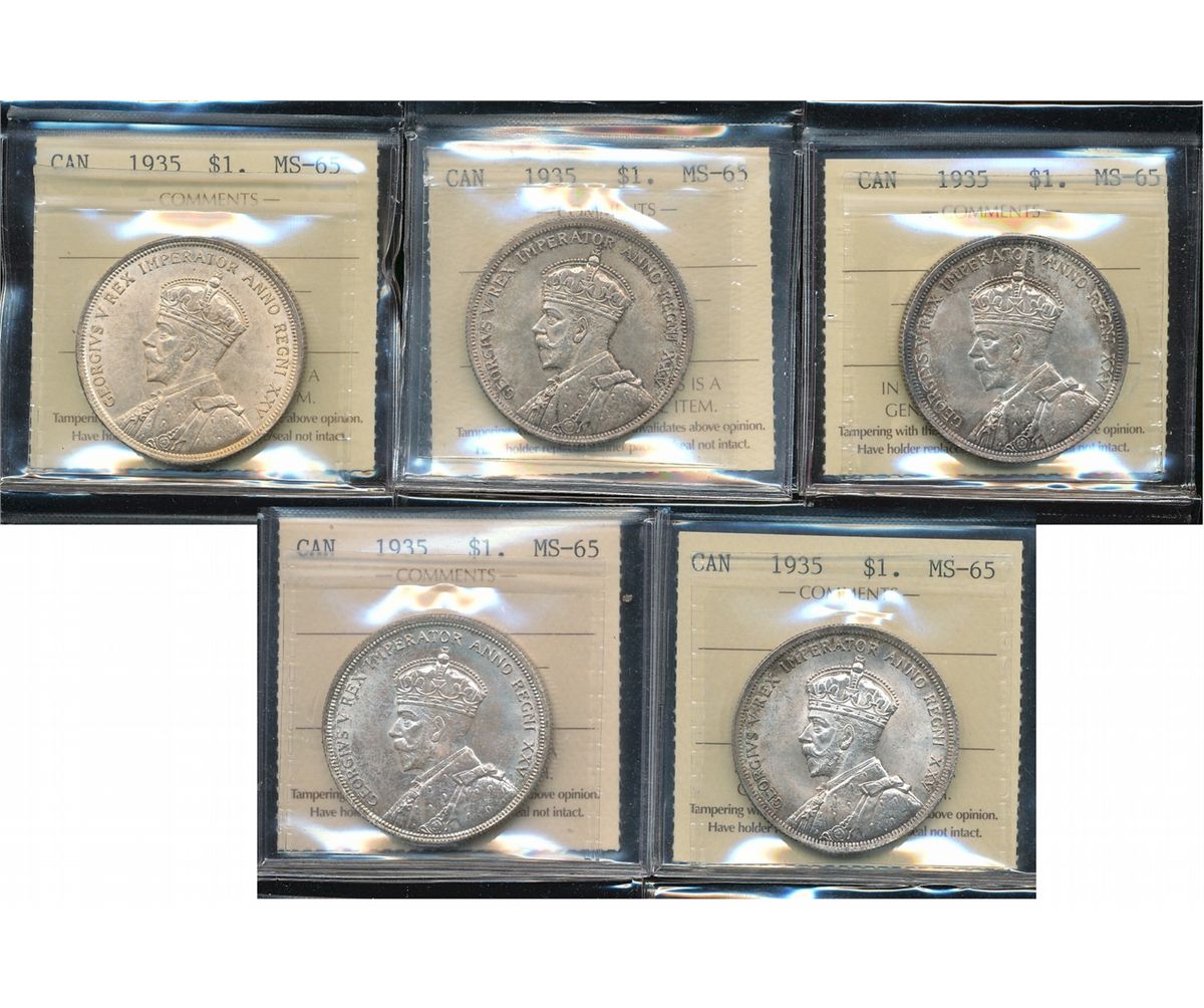 1935 $1 ICCS MS65. Lot of 5 Pcs all Gem issues some toned.