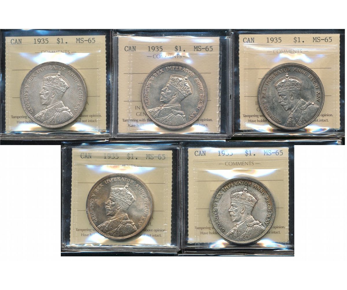 1935 $1 ICCS MS65. Lot of 5 pcs all Gem issues most with attractvie light tones.