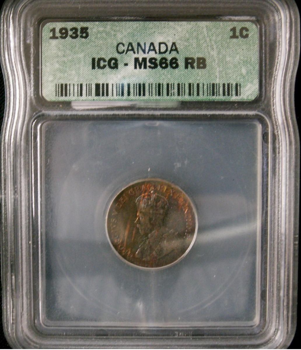 1935 1¢ ICG MS66RB. Razor sharp details with rainbow toning.