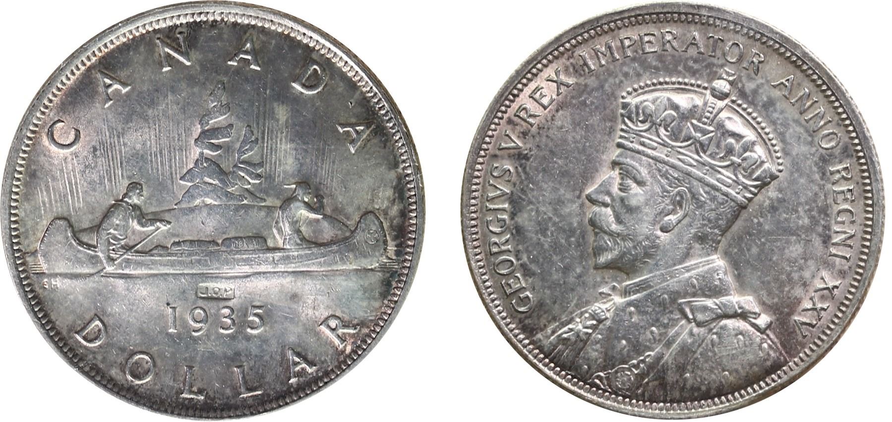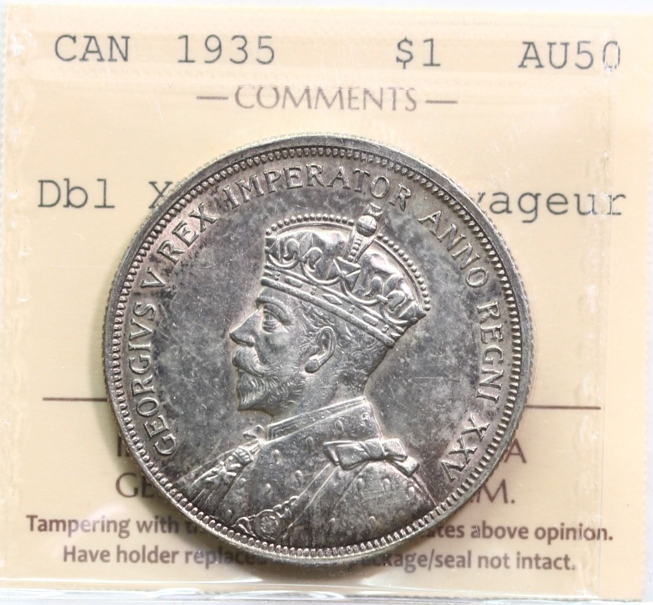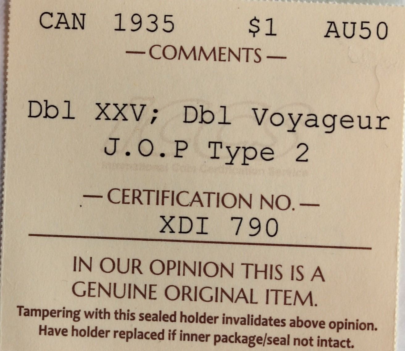 1935 $1 "J.O.P. Type 2 & Dbl XXV & Dbl Voyageur" ICCS About Uncirculated-50. Rare "Triple" Variety With Nice Eye Appeal. This example of the sought after "JOP" variety may be quite unique. We have offered a few other "JOP" examples in the past however this is the first one with three distinct varieties on the same coin. All in all, this is a fascinating study piece and a very scarce variety, likely more difficult to find than many of the popular HP and waterline variations. A unique and noteworthy opportunity for the conscious silver dollar variety collector.