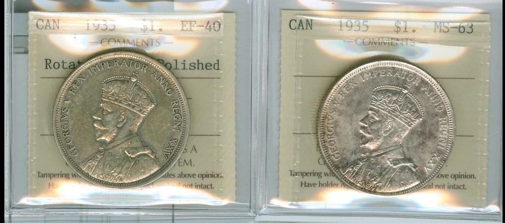 1935 $1 MS63 & 1935 $1 EF40 Rotated Dies, Polished. Lot of 2 ICCS graded coins.