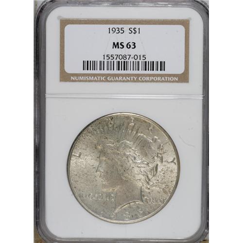 <B>1935 $1 MS63 NGC.</B></I> NGC Census: (1130/2163). PCGS Population (1740/2381). Mintage: 1,576,000. Numismedia Wsl. Price for NGC/PCGS coin in MS63: $84. (#7378)<BR><BR><b>Shipping:</b> Coins & Currency (<a target="_blank" href="http://www.heritageauctions.com/common/shipping.php">view shipping information</a>)