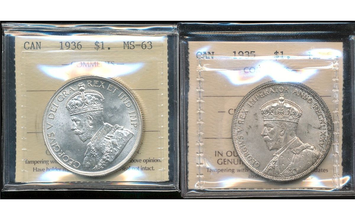 1935 $1 MS64 & 1936 MS63. Lot of 2 ICCS graded coins.
