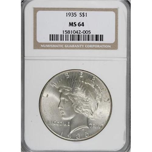<B>1935 $1 MS64 NGC.</B></I> NGC Census: (1534/661). PCGS Population (1689/741). Mintage: 1,576,000. Numismedia Wsl. Price for NGC/PCGS coin in MS64: $154. (#7378)<BR><BR><B>Coin Engraver:</B> Anthony de Francisci<BR><BR><b>Shipping:</b> Coins & Currency (<a target="_blank" href="http://www.heritageauctions.com/common/shipping.php">view shipping information</a>)