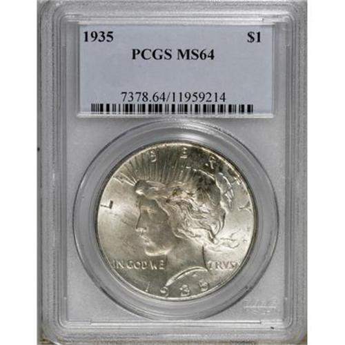 <B>1935 $1 MS64 PCGS.</B></I> . PCGS Population (1728/766). NGC Census: (1574/674). Mintage: 1,576,000. Numismedia Wsl. Price for NGC/PCGS coin in MS64: $165. (#7378)<BR><BR><B>Coin Engraver:</B> Anthony de Francisci<BR><BR><b>Shipping:</b> Coins & Currency (<a target="_blank" href="http://www.heritageauctions.com/common/shipping.php">view shipping information</a>)