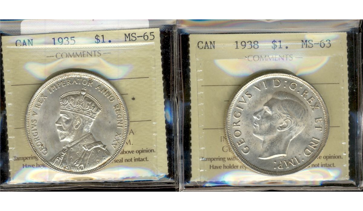 1935 $1 MS65 & 1938 MS63. Lot of 2 ICCS coins.
