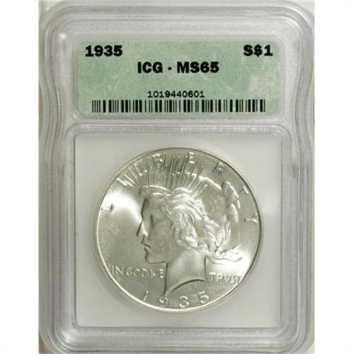 <B>1935 $1 MS65 ICG.</B></I> NGC Census: (602/55). PCGS Population (582/146). Mintage: 1,576,000. Numismedia Wsl. Price for NGC/PCGS coin in MS65: $520. (#7378)<BR><BR><b>Shipping:</b> Coins & Currency (<a target="_blank" href="http://www.heritageauctions.com/common/shipping.php">view shipping information</a>)