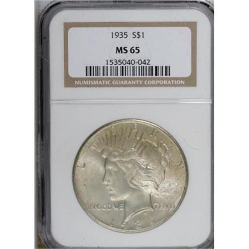 <B>1935 $1 MS65 NGC.</B></I> NGC Census: (606/55). PCGS Population (592/150). Mintage: 1,576,000. Numismedia Wsl. Price for NGC/PCGS coin in MS65: $520. (#7378)<BR><BR><B>Coin Engraver:</B> Anthony de Francisci<BR><BR><b>Shipping:</b> Coins & Currency (<a target="_blank" href="http://www.heritageauctions.com/common/shipping.php">view shipping information</a>)