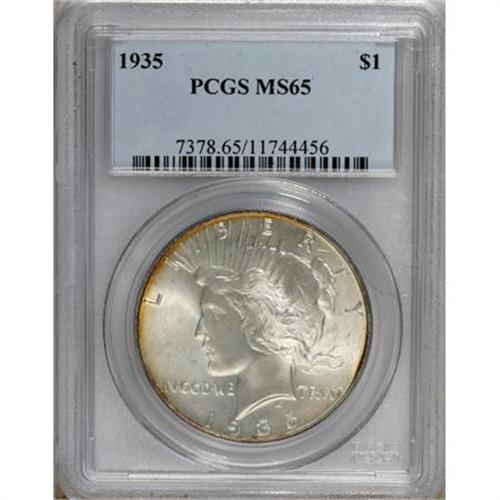 <B>1935 $1 MS65 PCGS.</B></I> PCGS Population (589/150). NGC Census: (605/55). Mintage: 1,576,000. Numismedia Wsl. Price for NGC/PCGS coin in MS65: $520. (#7378)<BR><BR><B>Coin Engraver:</B> Anthony de Francisci<BR><BR><b>Shipping:</b> Coins & Currency (<a target="_blank" href="http://www.heritageauctions.com/common/shipping.php">view shipping information</a>)