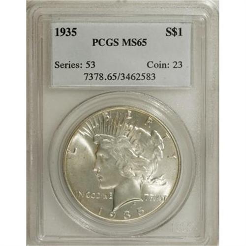<B>1935 $1 MS65 PCGS.</B></I> PCGS Population (589/150). NGC Census: (605/55). Mintage: 1,576,000. Numismedia Wsl. Price for NGC/PCGS coin in MS65: $520. (#7378)<BR><BR><B>Coin Engraver:</B> Anthony de Francisci<BR><BR><b>Shipping:</b> Coins & Currency (<a target="_blank" href="http://www.heritageauctions.com/common/shipping.php">view shipping information</a>)