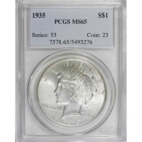 <B>1935 $1 MS65 PCGS.</B></I> PCGS Population (602/151). NGC Census: (610/57). Mintage: 1,576,000. Numismedia Wsl. Price for NGC/PCGS coin in MS65: $520. (#7378)<BR><BR><B>Coin Engraver:</B> Anthony de Francisci<BR><BR><b>Shipping:</b> Coins & Currency (<a target="_blank" href="http://www.heritageauctions.com/common/shipping.php">view shipping information</a>)