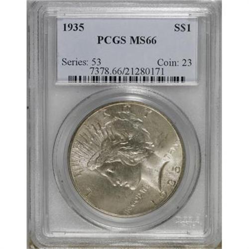<B>1935 $1 MS66 PCGS.</B></I> Subtle mauve and silver-lavender tints characterize this satiny and delightful final-year Peace dollar. Solidly struck and impressively preserved. PCGS has graded no finer pieces (2/08).<BR><BR><B>Coin Engraver:</B> Anthony de Francisci<BR><BR><b>Shipping:</b> Coins & Currency (<a target="_blank" href="http://www.heritageauctions.com/common/shipping.php">view shipping information</a>)