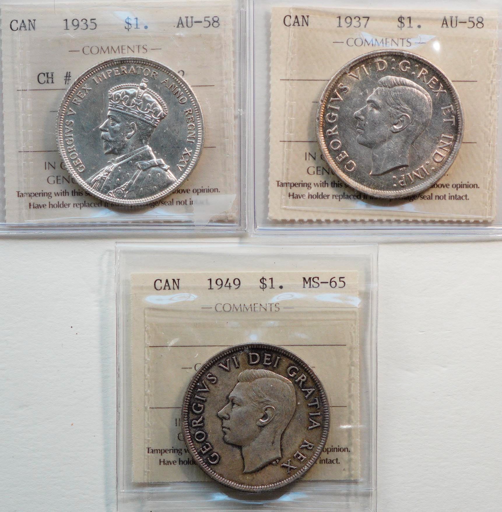 1935 $1 "Obv-002", 1937, 1949. Lot of 3 coins ICCS Choice About Uncirculated-58 to Gem Mint State-6