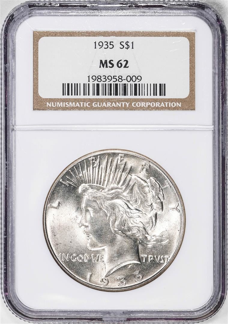 One 1935 $1 Peace Silver Dollar Coin NGC MS62. NGC Certified.