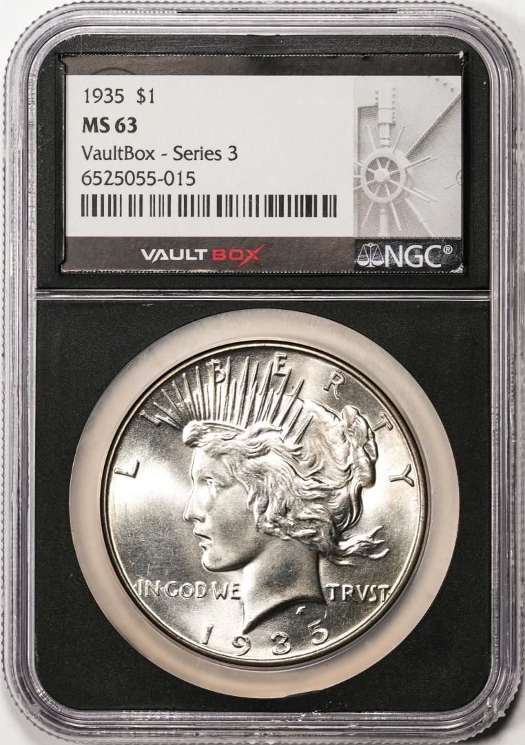One 1935 $1 Peace Silver Dollar Coin NGC MS63 Vaultbox Series 3. NGC Certified.